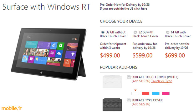 واحد خبر mobile.ir : کمپانی مایکروسافت قیمت تبلت های Surface RT خود را اعلام نمود و پیش فروش آنها را در بخش سرفیس فروشگاه آنلاین مایکروسافت آغاز نمود. این تبلت ها به سیستم عامل Windows RT مجهزند.