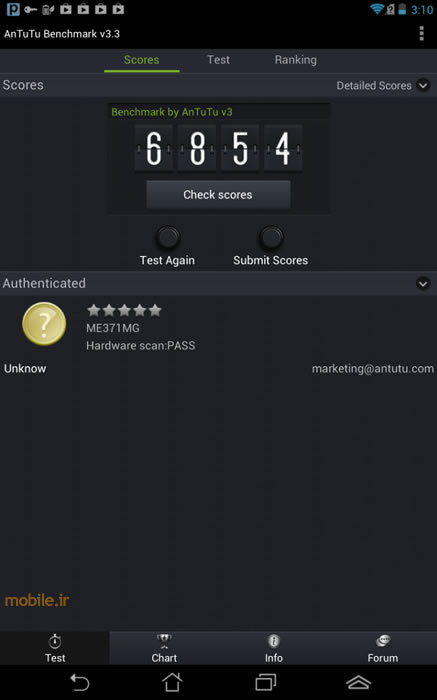 در تست تعیینکننده AnTuTu که همانند Quadrant کلیه قسمتهای دستگاه را مورد بررسی و سنجش قرار میدهد امتیاز نهایی دستگاه رقمی در حدود 6800 است. امتیاز نکسوس 7 در این تست نزدیک به دو برابر رقم ثبت شده توسط فونپد و عددی نزدیک به 12800 است.