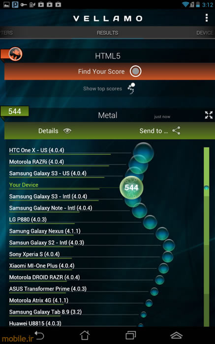 در نهایت آخرین تست صورت پذیرفته روی این تبلت تست Metal از بنچمارک Vellamo است که با امتیاز 544 بار دیگر نتیجه بسیار متوسطی را از خود نشان میدهد.