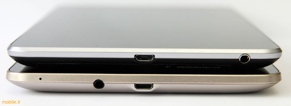 بخش بالایی تبلت به میکروفون دوم دستگاه برای حذف نویز و فیلمبرداری با صدای استریو تعلق دارد و در پایین نیز میکروفون تماس، جک هدست و پورت Micro USB حضور دارند. میکروفونهای دوگانه نکسوس 7 در کنارههای چپ و راست این تبلت قرار گرفتهاند ولی این دو المان در fonepad به بالا و پایین دستگاه منتقل شدهاند.