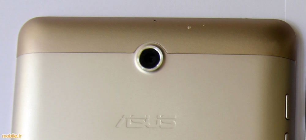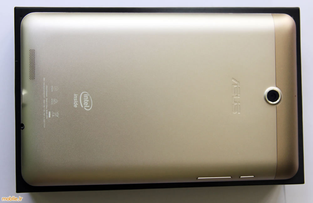 جذابیتهای ظاهری fonepad در پشت دستگاه نیز کاملا ادامه پیدا میکند. تقریبا کل این بخش از فلز ساخته شده و در این میان تنها حاشیه کوچکی در بالای دوربین پلاستیکی است. لنز دوربین 3.15 مگاپیکسلی fonepad در بالا قرار دارد و نشان حک شده Asus در پایین آن دیده میشود. دیگر موارد حاضر در این قسمت نشان متفاوت Intel inside و اسپیکر اصلی در پایین سمت چپ است. حضور نام اینتل در یک تبلت اندرویدی در مقایسه با سایر تبلتهای امروزی که همگی بر پایه پردازندههای ARM طراحی شدهاند نکته جالب و جذابی به نظر میرسد.