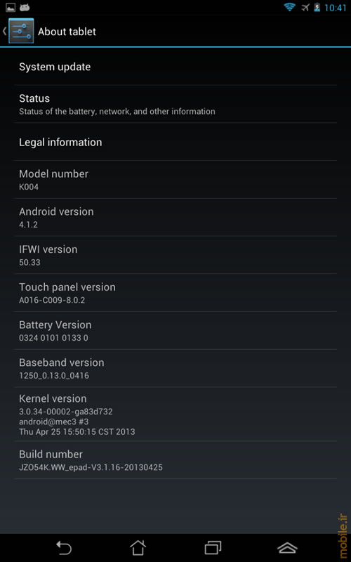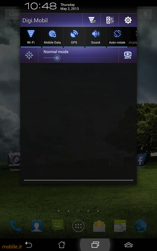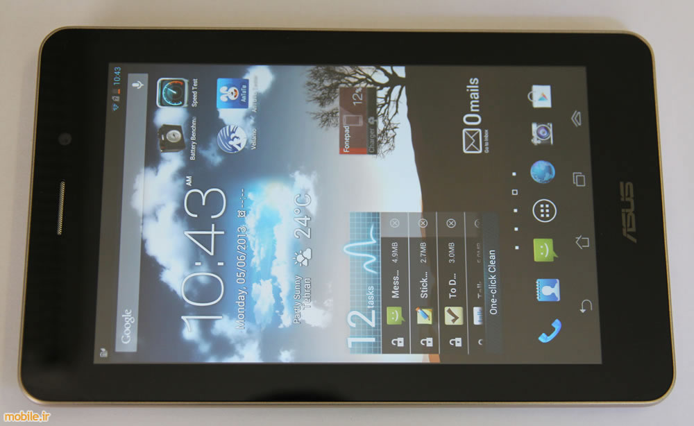 یکی از بزرگترین اختلافهای قابل ذکر مابین نکسوس 7 و fonepad در بخش قابل اسکرول بالای صفحهنمایش اتفاق افتاده است. در این بخش برخلاف نکسوس 7 که بکل فاقد toggleهای معروف این قسمت است از یک Notification Area به نسبت کامل استفاده شده است. این قسمت البته از درون منوهای دستگاه با برداشتن تیک Asus Quick setting به حالت عادی بازگشته و بار دیگر ظاهری مشابه نکسوس 7 بدون toggle به خود میگیرد. در این حالت بحز زمان و تاریخ و notification برنامهها تنها میانبری برای دسترسی به Setting و دکمه چرخش خودکار پنل حضور دارد.
