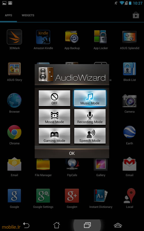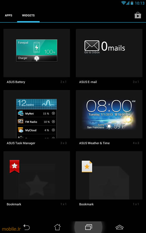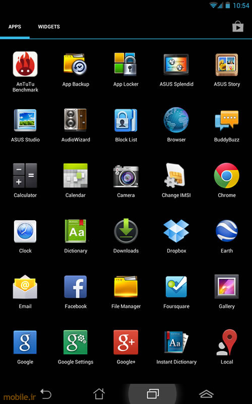 با گذر از تفاوتهای منویی fonepad و نکسوس 7 اوضاع در سایر قسمتها بدون تغییر است. منوی اصلی یا app drawer تبلت بار دیگر به فرم همیشگی به دو قسمت Apps و Widgets در بالا تقسیم شده که با اسکرول افقی بین آنها میتوان جابجا شد. کلیدهای چهارگانه زیر صفحهنمایش در منوی اصلی نیز در دسترس قرار دارند و در بخش بالا سمت راست نیز میانبر کوچکی برای دسترسی مستقیم به Google Play در نظر گرفته شده است.