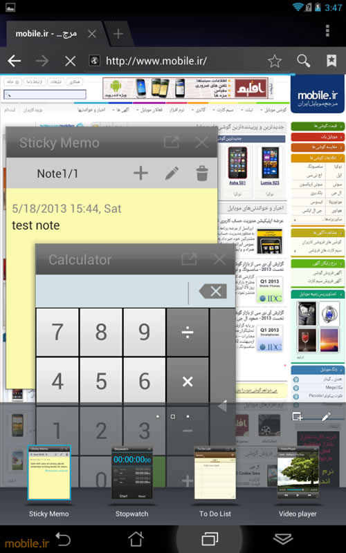 در مرکز بخش پایینی صفحهنمایش در Home Screen کلید دسترسی به منوی اصلی جای دارد که در دو سوی آن مجموعا 6 آیکون یا فولدر دلخواه را میتوان جای داد. یک پله پایینتر از این قسمت نوار کلیدهای مجازی اندرویدی است که در میان آنها یک کلید جدید با نشان فلش رو به بالا در سمت راست دیده میشود که با لمس آن لیستی از مینیاپلیکیشنهای با قابلیت اجرای همزمان در دسترس قرار میگیرد. تعداد اپلیکیشنهای این لیست البته محدود است اما تقریبا همگی آنها مثل ماشینحساب، تقویم و برنامه یادداشت بشدت کاربردی به نظر میرسند.